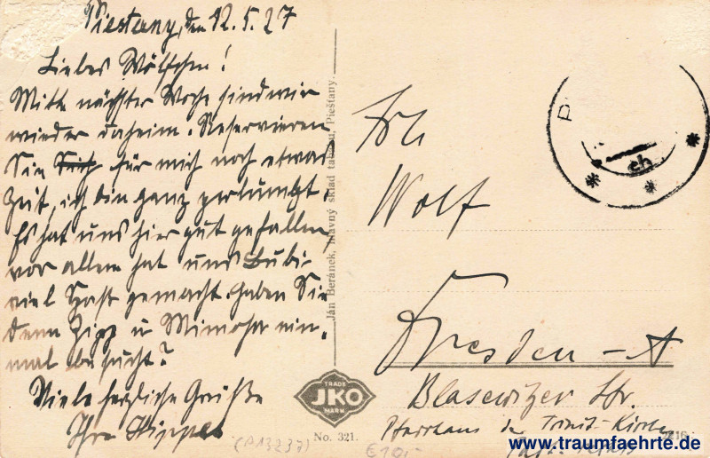 – Details – Jahr: ca. 1925 Status: gelaufen 1927, Briefmarke entfernt Beschriftung vorne: Piešťany. Staré kúpele. Beschriftung hinten: JKO, Trade Mark, No. 321, Ján Beránek, hlavný sklad tabaku, Piešťany. 2216. Stempel: P[iešťany], ch, * * *, […] Hinweis: