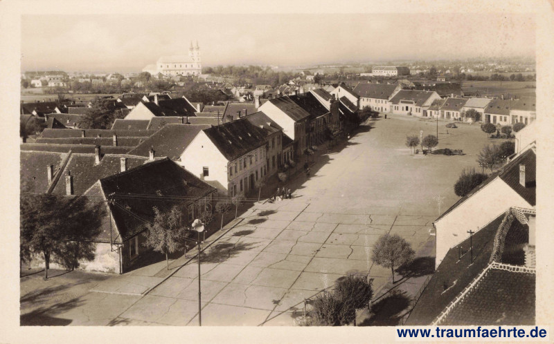 Schwarzweißfotografie – Platz (heutige Alej?) mit Häusern, Bäumen, Laternen und Statue, Basilika von den Sieben Schmerzen Mariens (Bazilika Sedembolestnej Panny Márie) mit Zwillingstürmen im Hintergrund