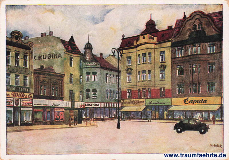 Schlagworte: Plätze, Oldtimer, Autos, Laternen, Eckhäuser, Künstlerkarten, Mähren, Schlesien, Zweiter Weltkrieg