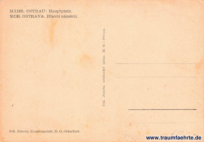 Beschriftung hinten: Mähr. Ostrau: Hauptplatz. Mor. Ostrava. Hlavni náměstí. Jak. Janota, Kunstanstalt, M.O.-Oderfurt. Jak. Janota, umělecký ústav. M.O.-Přívoz. 199