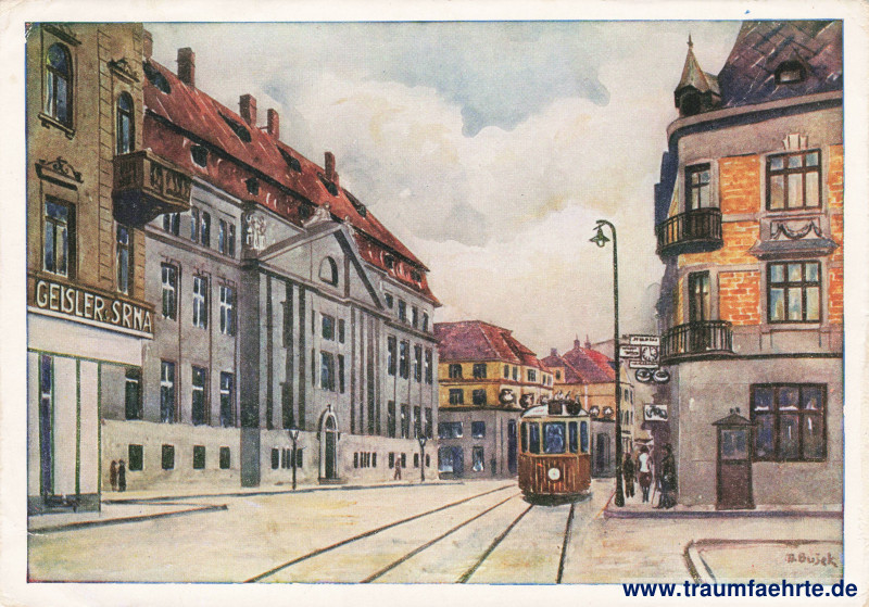 Schlagworte: Künstlerkarten, Banken, Säulen, Straßenbahnen, Schienen, Laternen, Eckhäuser, Mähren, Schlesien