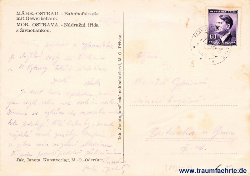 Beschriftung hinten: Mähr.-Ostrau. – Bahnhofstraße mit Gewerbebank. Mor. Ostrava. – Nádražní třída s Živnobankou. Jak. Janota, Kunstanstalt, M.-O.-Oderfurt. Jak. Janota, umělecký ústav, M. O.-Přívoz.