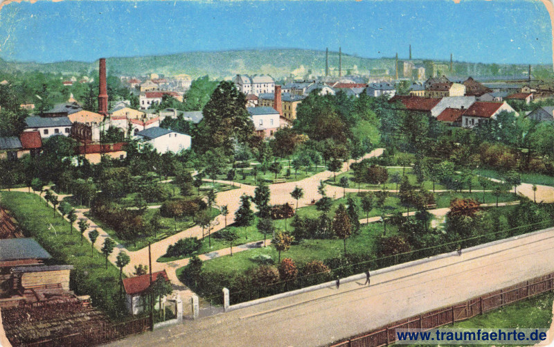 Schlagworte: Parks, Sägewerke, Schornsteine, Zäune, Hügel, Panorama, Schlesien, Mähren
