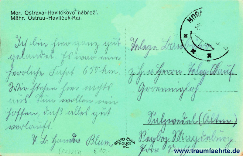 Beschriftung hinten: Mähr. Ostrau--Havlíčkovo nábřeží. Mähr. Ostrau--Havlíčko-Kai. Grafo Čuda, Holice v Č.