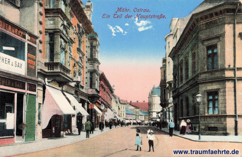 – Details – Year: ca. 1910 Postal state: postally used without stamp (military mail), 1915 Inscription front: Mähr. Ostrau. Ein Teeil der Hauptstraße. Inscription back: Alleinverlag Ignaz Kramer, Oderberg I. SUOE Postmark(s): Ratibor, * 1 k, 30.6.15 5–6[V] Please note:
