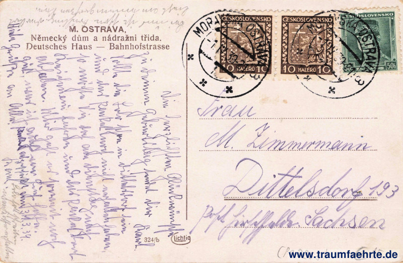 Inscription front: M. Ostrava, Německý dům a Nádražní třída. Deutsches Haus – Bahnhofstrasse. 324/b, Lichti