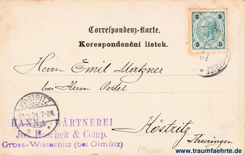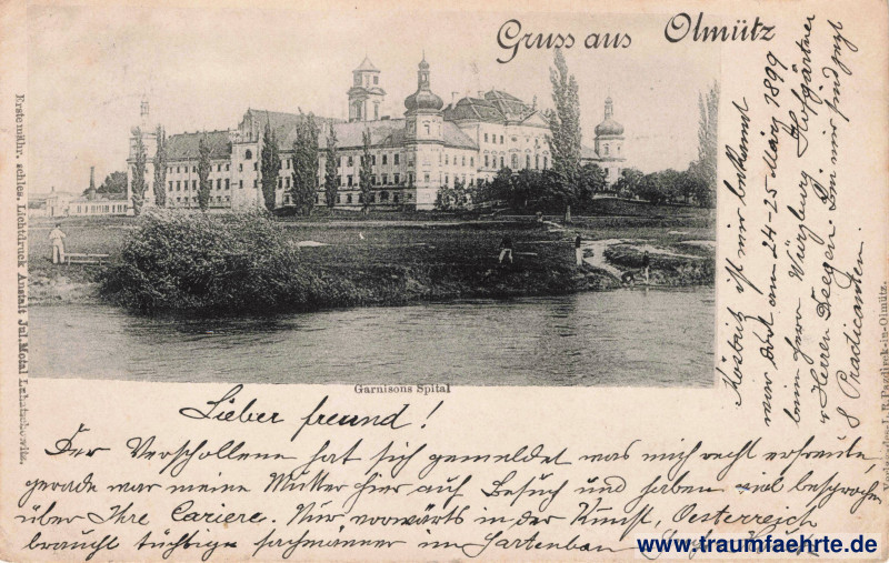 – Details – Jahr: ca. 1900 Status: gelaufen 1901 Beschriftung vorne: Gruss aus Olmütz, Garnisions Spital, Erste mähr. schles. Lichtdruck Anstalt Jul. Motal Luhatschowitz, Verlag des L. R. Pazdirek in Olmütz. Beschriftung hinten: Correspondenz-Karte. Korespondenční lístek. Stempel: […] Bystřice, 19 11 01; Kötritz, * * *, 20.11.01.7–8N. Hinweis: