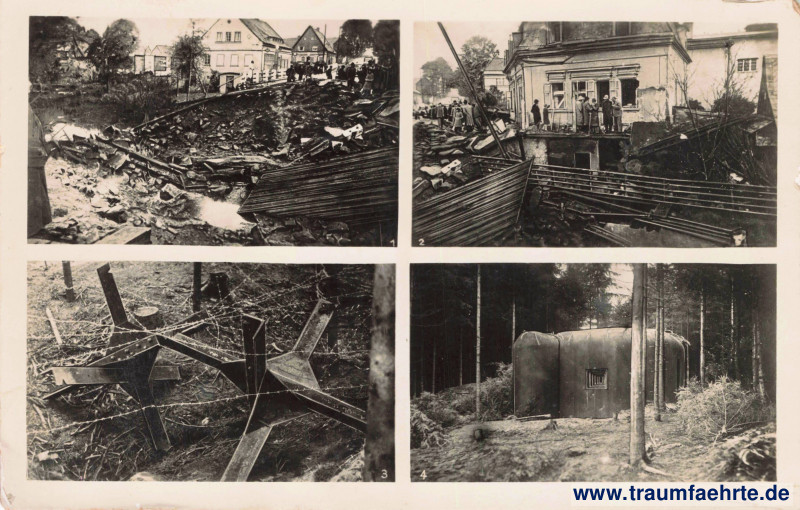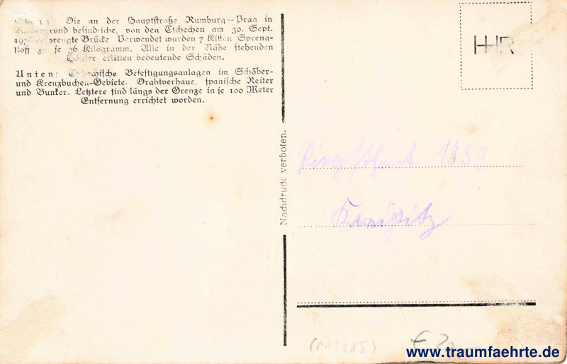 – Details – Jahr: 1938/39 Status: beschrieben 1939, aber ungelaufen Beschriftung vorne: kein Text Beschriftung hinten: Oben: Die an der Hauptstraße Rumburg – Prag in Niedergrund befindliche, von den Tschechen am 30. Sept. 1938 gesprengte Brücke. Verwendet wurden 7 Kisten Sprengstoff zu je 36 Kilogramm. Alle in der Nähe stehenden Häuser erlitten bedeutende Schäden. Unten: Tschechische Befestigungsanlagen im Schöber- und Kreuzbuchen-Gebiete. Drahtverhaue, spanische Reiter und Bunker. Letztere sind längs der Grenze in je 100 Meter Entfernung errichtet worden. Nachdruck verboten. HHR Stempel: keine Hinweis:
