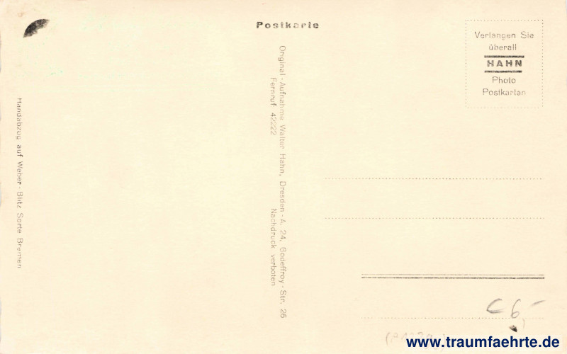 – Details – Year: ca. 1935 Postal state: postally unused Inscription front: Sächs-Schweiz, Falkenstein und Hoher Torstein, Hahn, 166, Dresden Inscription back: Postkarte, Original-Aufnahme Walter Hahn, Dresden-A. 24, Godeffroy-Str. 26, Fernruf: 42222, Nachdruck verboten, Handabzug auf Weber- Blitz Sorte Bremen, Verlangen Sie überall HAHN Photo Postkarten Postmark(s): none Please note: