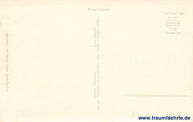 – Details – Jahr: ca. 1935 Status: ungelaufen Beschriftung vorne: Dresden-Weisser Hirsch, Dr. Lahmanns Sanatorium, Hahn, 7534, Dresden Beschriftung hinten: Postkarte, Original-Aufnahme Walter Hahn, Dresden-A. 24, Godeffroy-Str. 26, Fernruf: 42222, Nachdruck verboten, Handabzug auf Weber- Medio Sorte Sudeten, Verlangen Sie überall HAHN Photo Postkarten Stempel: keine Hinweis:
