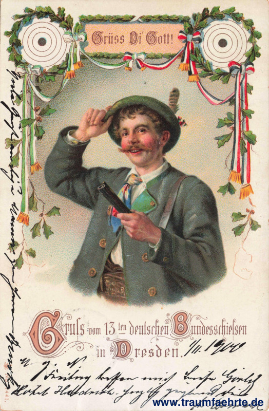 – Details – Year: 1900 Postal state: postally used 1900 Inscription front: Gruss vom 13ten deutschen Bundesschiessen in Dresden. Grüß di' Gott! No. 7441. Inscription back: Postkarte, An … in … Wohnung (Straße und Hausnummer) … Postmark(s): Dresden-Altst. 2, –1.11.00.9–10N.; Liegnitz, * 1 f, –2.11.00. 6–7V. Please note: