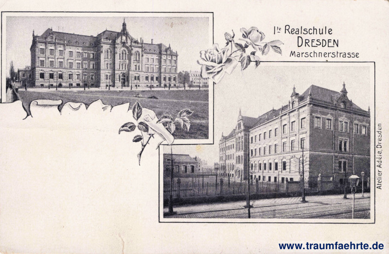 Beschriftung vorne: 1te Realschule Dresden, Marschnerstrasse, Ateier Adèle, Dresden