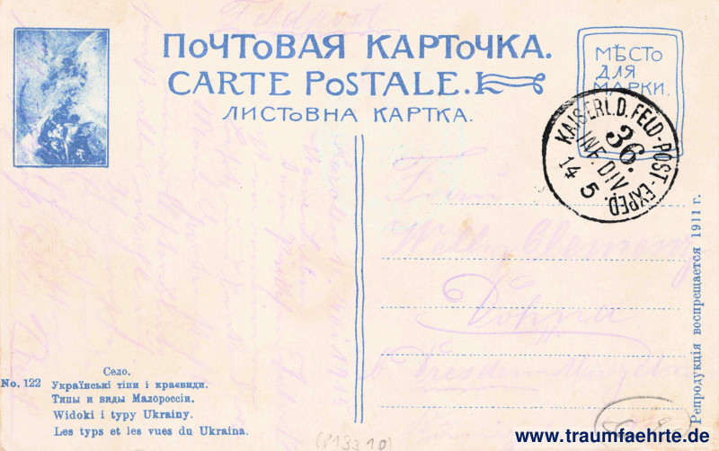 – Details – Jahr: 1911 Status: gelaufen ohne Briefmarke (Feldpost), 1915 Beschriftung vorne: Почтовая карточка. Carte postale. Листовна картка. Мѣсто для марки. No. 122, Село. Українські тіпи і краєвиди. Типы и виды Малороссіи. Widoki i typy Ukrainy. Les typs et les vues du Ukraina. Препродукція воспрещается 1911 г. Beschriftung hinten: kein Text Stempel: Kaiserl. D. Feld-Post-Exped., 36. Inf.Div. 14 5; Brief-Stempel, K. S. Res.-Fussart.-Bataillon Nr. 19, L.-Mun.Kol. Hinweis: