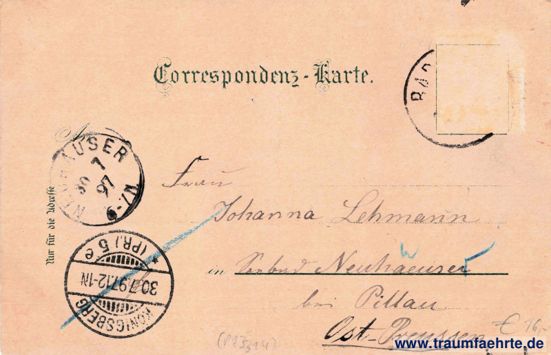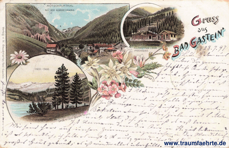 – Details – Jahr: ca. 1895 Status: gelaufen 1897, Briefmarke entfernt Beschriftung vorne: Gruss aus Bad Gastein, Kötschachthal mit der Himmelwand. Alphütte i. der Prossau. Red-See. Red-See. Verlag v. M. Gessenharter, Bad Gastein. Beschriftung hinten: Correspondenz-Karte. Nur für die Adresse Stempel: keine Hinweis: