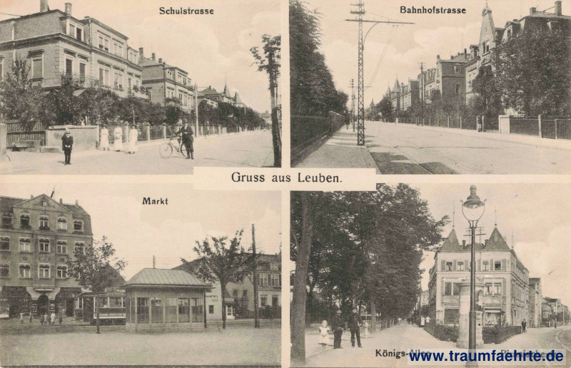 Beschriftung vorne: Gruss aus Leuben. Schulstrasse, Bahnhofstrasse, Markt, Königs-Allee, Pirnaischestr.