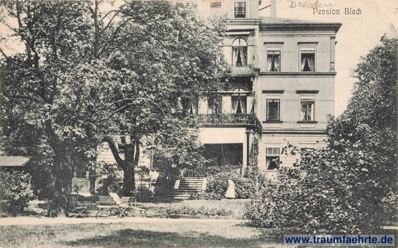 grey monochrome photograph – villa with balconies and stairs, garden with woman in a dress, deck chair, and chairs in front, trees and bushes