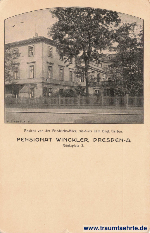– Details – Jahr: ca. 1895 Status: ungelaufen Beschriftung vorne: Pensioknat Winckler, Dresden-A., Güntzplatz 2. Ansicht von der Friedrichs-Allee, vis-à-vis dem Engl. Garten. F. S. Jahn, K. A. Beschriftung hinten: Deutsche Reichspost, Postkarte. An … in … Wohnung (Straße und Hausnummer) … Stempel: keine Hinweis: