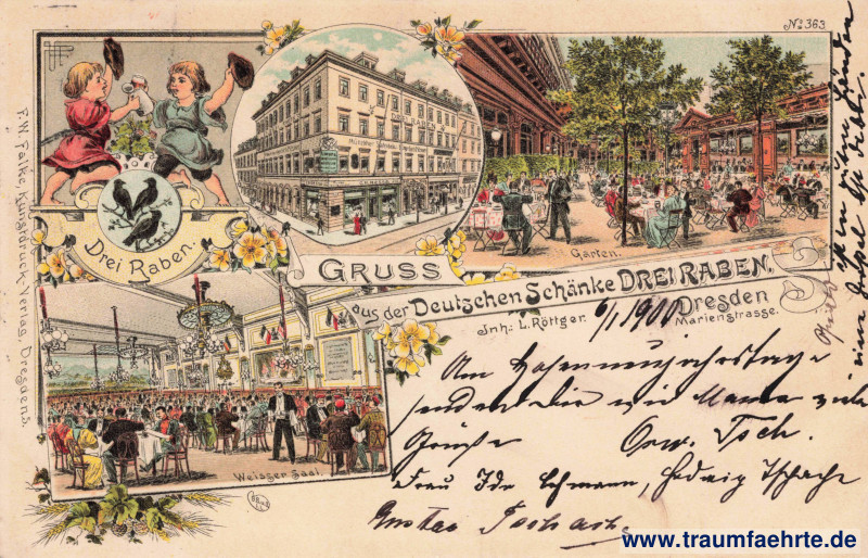 Beschriftung vorne: Gruss aus der Deutschen Schänke Drei Raben. Inh.: L. Röttger. Dresden, Marienstrasse. № 363. Drei Raben. Weisser Saal. Garten. F. W. Falke, Kunstdruck-Verlag, Dresden 5.