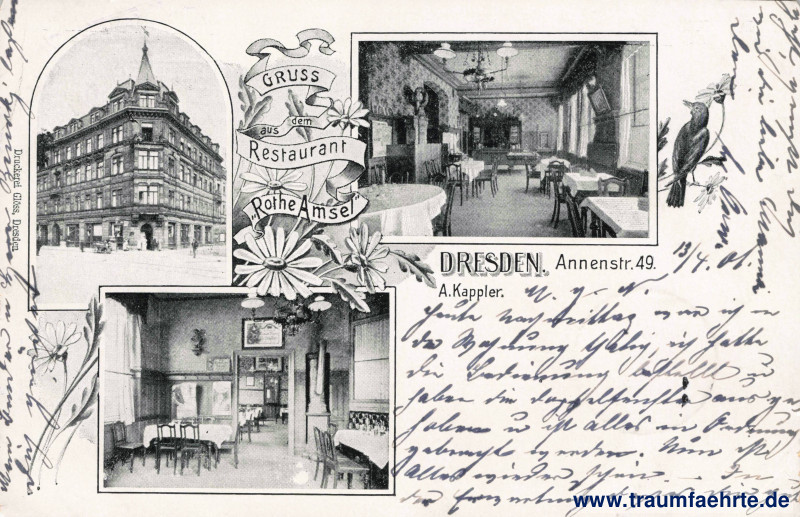 Beschriftung vorne: Gruss aus dem Restaurant „Rothe Amsel“, Dresden. Annenstr. 49. A. Kappler. Druck Glöss, Dresden.
