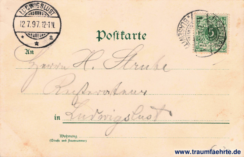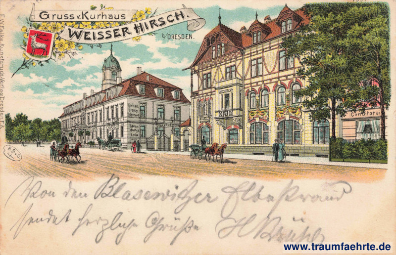 – Details – Jahr: ca. 1895 Status: gelaufen 1897 Beschriftung vorne: Gruss v. Kurhaus Weisser Hirsch. b/ Dresden. F. W. Falke, Kunstdruck-Verlag Dresden F. S., B. B. u. O. i. L., Kurhaus, Kurhaus Grosses Restaurant, Schöner […] Garten, Conditorei Beschriftung hinten: Postkarte, An … in … Wohnung (Straße und Hausnummer) … Stempel: Dresden-Blasewitz, […], 11.7.97[…]; Ludwigslust, * * a, 12.7.97. 12–1N. Hinweis: