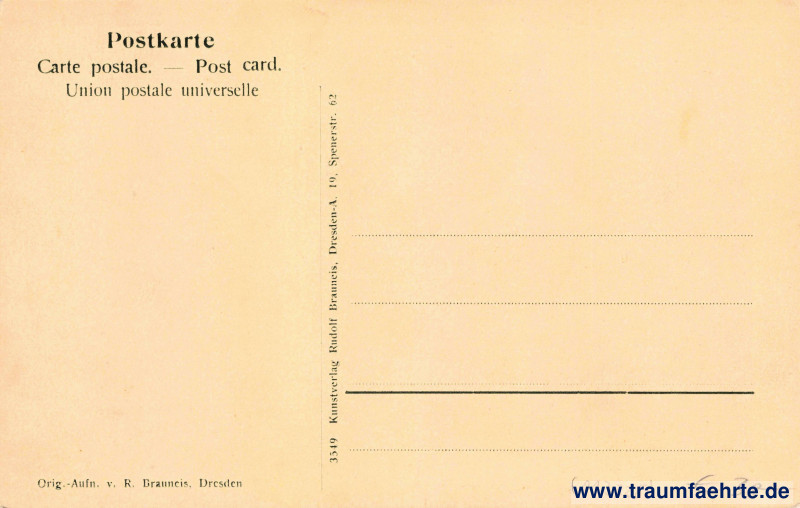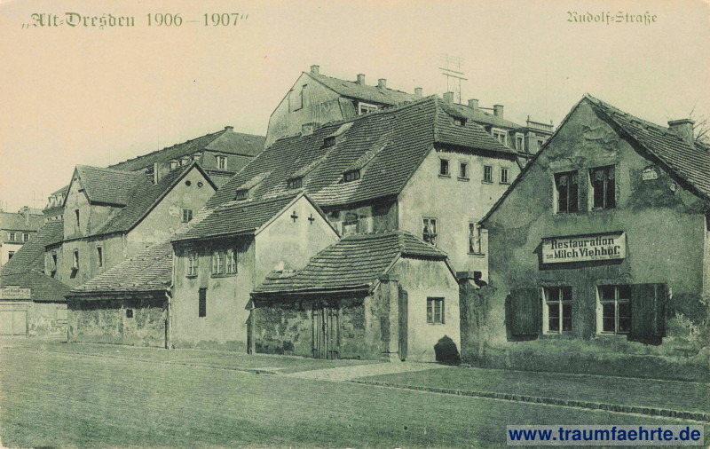– Details – Jahr: 1907 Status: ungelaufen Beschriftung vorne: „Alt-Dresden 1906–1907“, Rudolf-Straße, Restauration zum Milch Viehhof. Beschriftung hinten: Postkarte, Carte postale. – Post card. Union postale universelle, Orig.-Aufn. v. R. Brauneis, Dresden, 3549 Kunstverlag Rudolf Brauneis, Dresden-A. 19, Spenerstr. 62 Stempel: keine Hinweis: