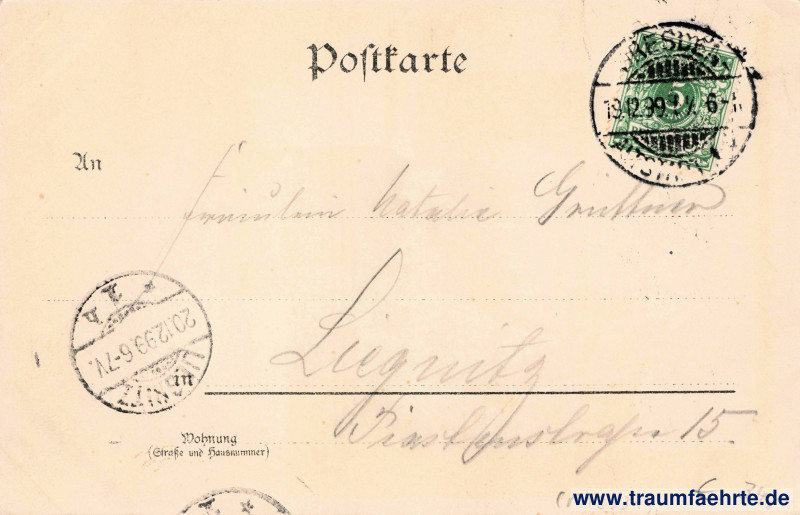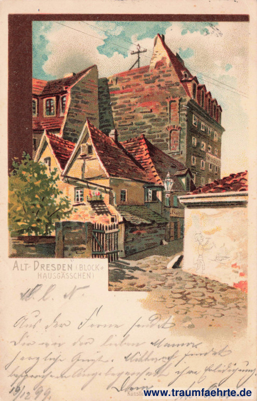 – Details – Jahr: ca. 1895 Status: gelaufen 1899 Beschriftung vorne: Alt-Dresden (Block-Hausgässchen), Künstler-Postkarte, Kunstanstalt Peitz u. Toepfer, Dresden. Holz[…], Möbel, … Beschriftung hinten: Postkarte, An … in … Wohnung (Straße und Hausnummer) … Stempel: Dresden-Altstadt [1…], 19.12.99 […]6[…]N; Liegnitz, * 1 h, 20.12.99.6–7V. Hinweis: