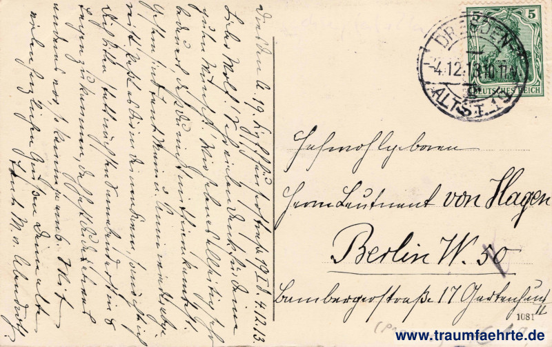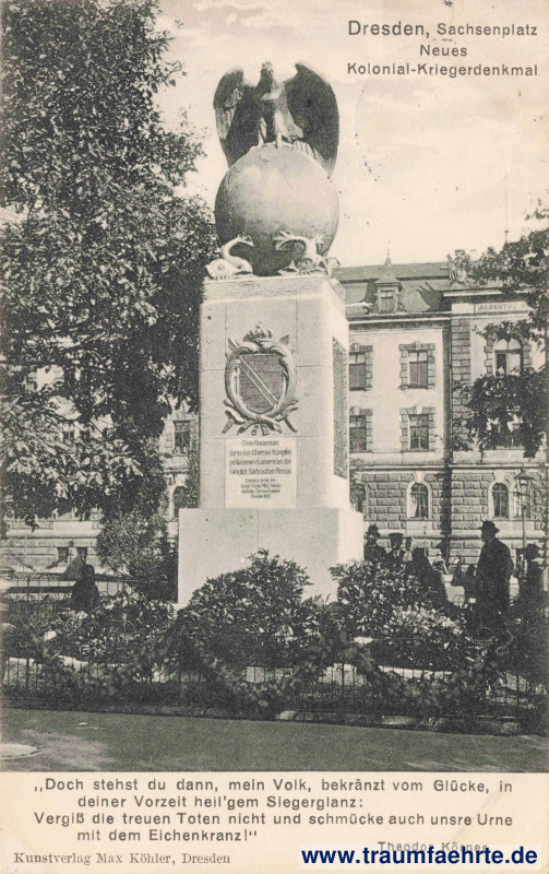 – Details – Jahr: ca. 1910 Status: gelaufen 1912 Beschriftung vorne: Dresden, Sachsenplatz, Neues Kolonial-Kriegerdenkmal, „Doch stehst du dann, mein Volk, bekränzt vom Glücke, in deiner Vorzeit heil'gem Siegerglanz: Vergi'die treuen Toten nicht und schmücke auch unsre Urne mit dem Eichenkrank!“ Theodor Körner. Kunsdtverlag Max Köhler, Dresden Beschriftung hinten: 1081 Stempel: Dresden-Altst. 19, –4.12.13. 10–11V. Hinweis: