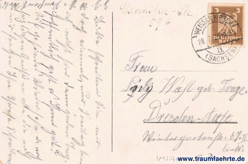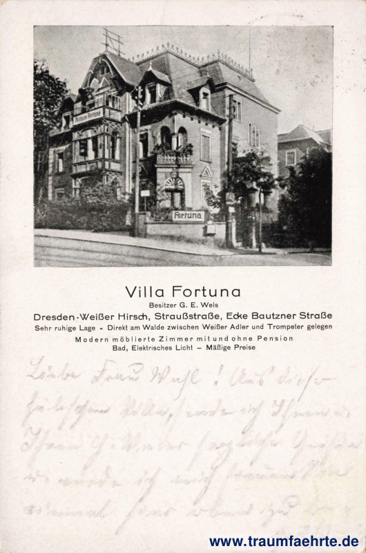 – Details – Jahr: ca. 1920 Status: gelaufen 1925 Beschriftung vorne: Villa Fortuna, Besitzer G. E: Wels, Dresden-Weißer Hirsch, Straußstraße, Ecke Bautzner Straße, Sehr ruhige Lage – Direkt am Walde zwischen Weißer Adler und Trompeter gelegen, Modern möblierte Zimmer mit und ohne Pension, Bad, Elektrisches Licht – Mäßige Preise, Pension Fortuna, Fortuna,… Beschriftung hinten: kein Text Stempel: Weisser Hirsch (Sachsen), a, 28.7.25. 10–11V Hinweis: