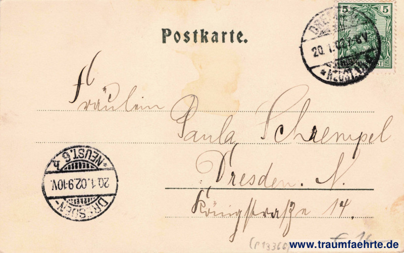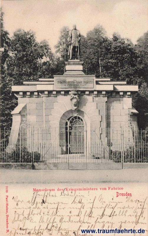 – Details – Jahr: ca. 1895 Status: gelaufen 1902 Beschriftung vorne: Dresden, Mausoleum des Kriegsmkinisters von Fabrice, 3139 Paul Heine, Dresden-N. Dem Kriegsminister Graf von Fabrice, Die sächsische Armee, 1892 Beschriftung hinten: kein Text Stempel: Dresden-Neust. 1[6, b], 20.1.02 7–8V.; Dresden-Neust. 6, h, 20.1.02 9–10V. Hinweis:
