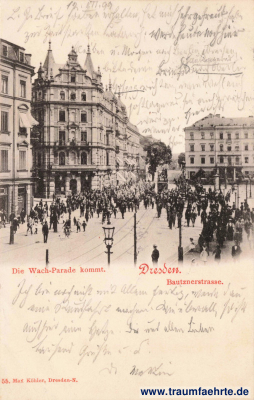 – Details – Jahr: ca. 1895 Status: gelaufen 1899 Beschriftung vorne: Dresden. Bautznerstrase. Die Wach-Parade kommt. 55. Max Köhler, Dresden-N. Beschriftung hinten: Postkarte. … Stempel: 2x Dresden-Altstadt 1, [g], 12.7.99 2½–3–N.; Amberg 2. Bhf., 13 Jul 99l Kast[…], 13 Jul 99, 7–[…] Hinweis: