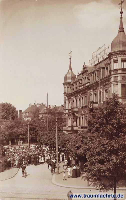 sepiafarbene Schwarzweißfotografie – Hotel mit Türmchen und Menschenmenge mit einzelnen Fahrrädern davor, 1. Pfingstfeiertag 1915