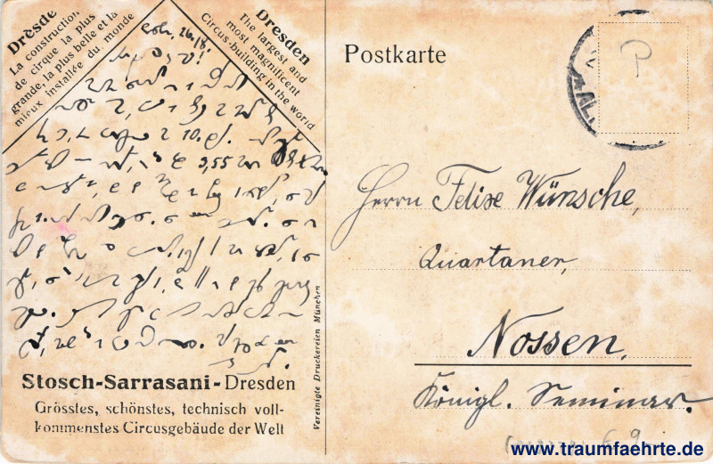 – Details – Year: ca. 1915 Postal state: postally used, stamp removed Inscription front: Eröffnung, Inauguration, Opened 1912, Erbaut: Architekten Heilmann & Littmann, München. Inscription back: Postkarte, Drèsde, La construction de cirque la plus grande, la plus belle et la mieux installée du monde, Dresden, The largest and most magnificent Circus-building in the world, Stosch-Sarrasani-Dresden, Grösstes, schönstes, technisch vollkommenstes Circusgebäude der Welt, Vereinigte Druckereien München Postmark(s): none Please note: