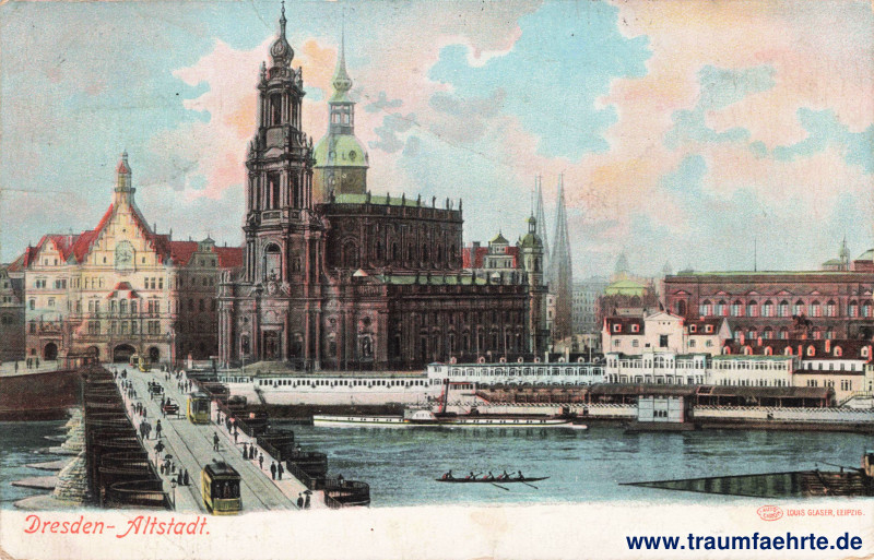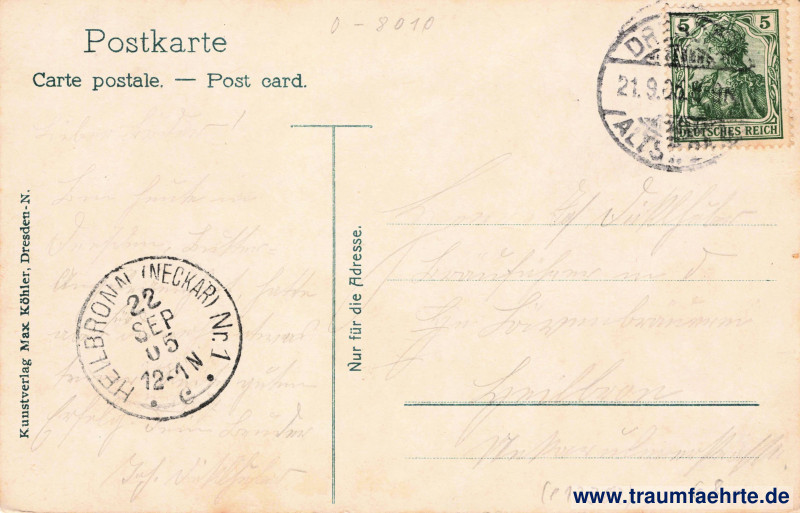 – Details – Jahr: ca. 1900 Status: gelaufen 1905 Beschriftung vorne: Dresden-Altstadt. Auto-Chrom Louis Glaser, Leipzig. Beschriftung hinten: Postkarte, Carte postale. – Post card. Kunstverlag Max Köhler, Dresden-N. Nur für die Adresse. Stempel: Dresden-Altst. [24], 21.9.05 8–9N.; Heilbronn (Neckar) Nr. 1, * c *, 22 Sep 05 12–1N Hinweis: