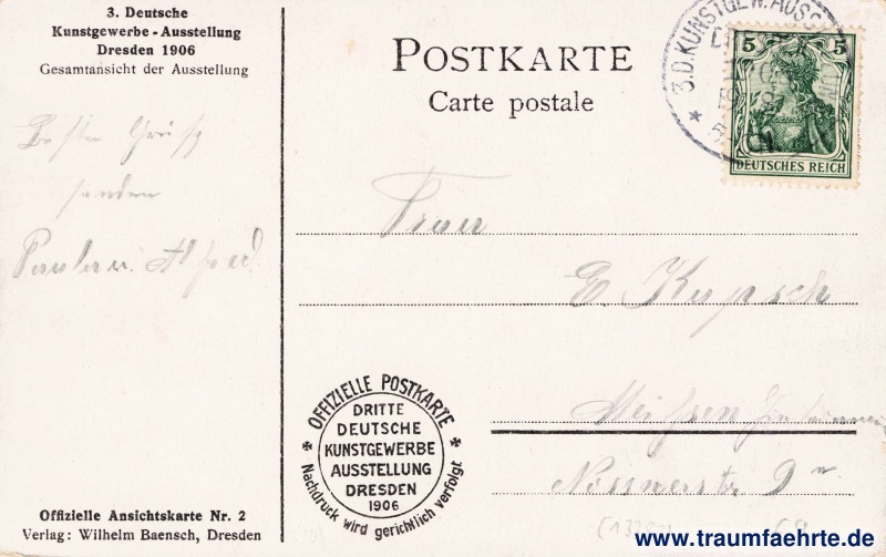 – Details – Jahr: 1906 Status: gelaufen 1906 Beschriftung vorne: kein Text Beschriftung hinten: Postkarte, Carte postale, 3. Deutsche Kunstgewerbe-Ausstellung 1906, Gesamtansicht der Ausstellung, Offizielle Ansichtskarte Nr. 2, Verlag: Wilhelm Baensch, Dresden, Offizielle Postkarte Dritte Deutsche Kunstgewerbe Ausstellung Dresden 1906, * *, Nachdruck wird gerichtlich verfolgt Stempel: 3. D. Kunstgew.ausstellung, 1906, 19.8. 5–6[…] Hinweis: