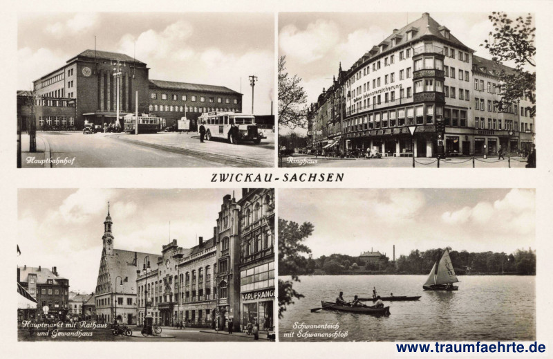 Beschriftung vorne: Zwickau-Sachsen, Hauptbahnhof, Ringhaus, Hauptmark mit Rathaus und Gewandhaus, Schwanenteich mit Schwanenschloß