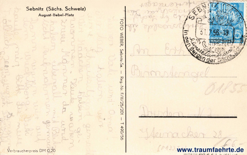 – Details – Jahr: 1956 Status: gelaufen 1956 Beschriftung vorne: kein Text Beschriftung hinten: Sebnitz (Sächs. Schweiz), August-Bebel-Platz, FOTO WEBER, Sebnitz-Sa. – Reg.-Nr. F/III/25/201 – T 490/56, Verbraucherpreis DM 0,20, III/25/18 692/6 6.2, lr / 645[1]56 Stempel: Sebnitz (Sachs.), Kunstblumenstadt, In den Bergen der Sächs. Schweiz, 31.7.56.–19 Hinweis: