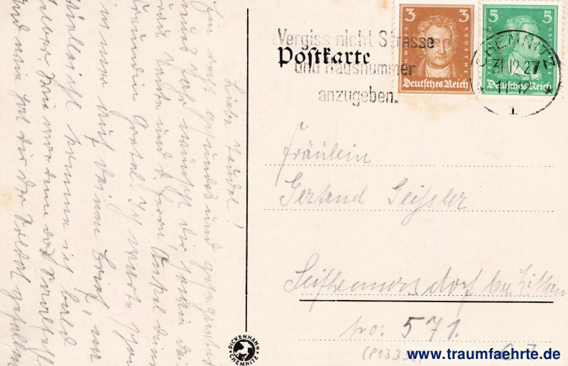 – Details – Jahr: ca. 1925 Status: gelaufen 1927 Beschriftung vorne: Staatliche Frauenklinik Chemnitz (Teilansicht) Beschriftung hinten: Postkarte, Dickenhahn Chemnitz Stempel: Chemnitz, 1, * *, 31.12.27 11–12; Vergiss nicht Straße und Hausnummer anzugeben Hinweis: