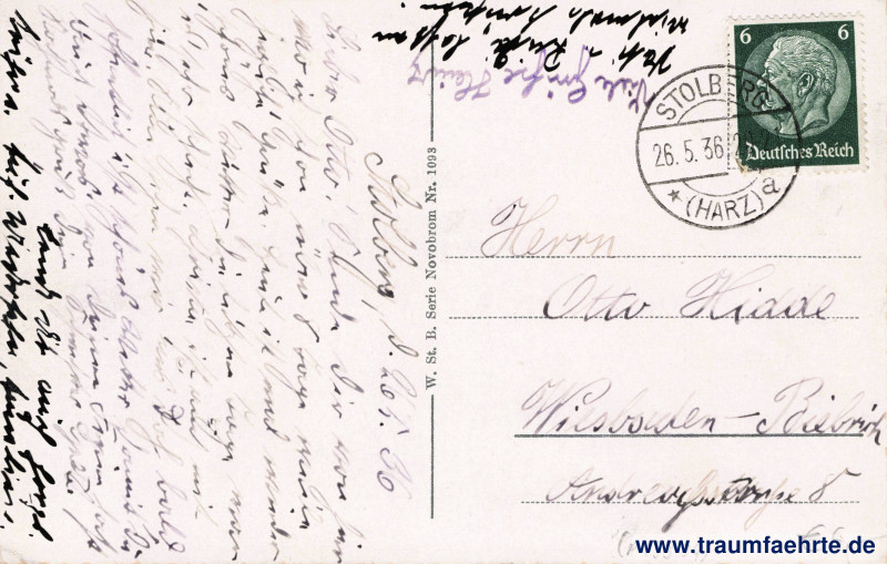 – Details – Jahr: ca. 1935 Status: gelaufen 1938 Beschriftung vorne: Stolberg i. Harz. Rathaus Beschriftung hinten: W. St. B. Serie Novobrom Nr. 1093 Stempel: Stolberg (Harz), * a, 26.5.36.20–21 Hinweis: