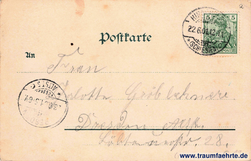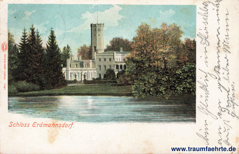 – Details – Jahr: ca. 1900 Status: gelaufen 1901 Beschriftung vorne: Schloss Erdmannsdorf, Auto-Chrom, Louis Glaser, Leipzig. 7857 Beschriftung hinten: Postkarte, An … Stempel: Hirschberg (Schlesien), * c, 22.6.01.12–1[…]; Dresden-Altst. 5, * c, 23.6.01.5–6V. Hinweis: