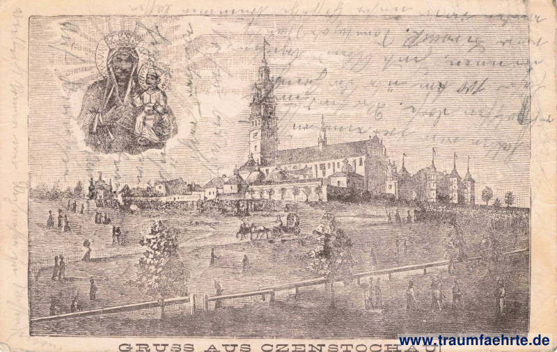 Lithographie mit zwei Ansichten – 1.) Paulinerkloster auf dem Jasna Góra mit Tür,em, davor Wiese, Bäume, Passanten, Kutschen und Zaun, 2.) Ikone (Maria? und Jesuskind mit Kronen)