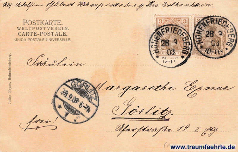 Stempel: 2x Hohenfriedeberg, * *, 28 9 03, 10–11; Görlitz, * 1 f, 28.9.03 6–7N