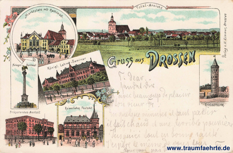 Beschriftung vorne: Gruss aus Drossen, Marktplatz mit Rathaus. Total-Ansicht, Krieger-Denkmal, Königl. Lehrer-Seminar, Diebensthurm. Präparanden-Anstalt, Kaiserliches Postamt, Verlag v. H. Zimmer, Drossen