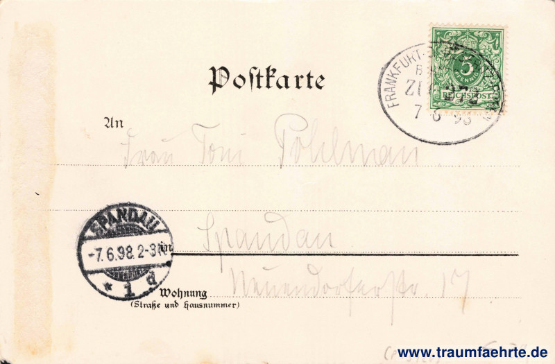 Stempel: Frankfurt – Messeritz – Posen, Bahnpost, Zug 272, 7 6 98; Spandau, * 1 d, –7.6.98.2–3N.