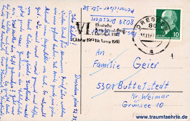 Postmark(s): Dresden, a, 13.11.67 [12]; VI. Deutsche Kunstausstellung Dresden 1967, Oktober 1967 bis Januar 1968