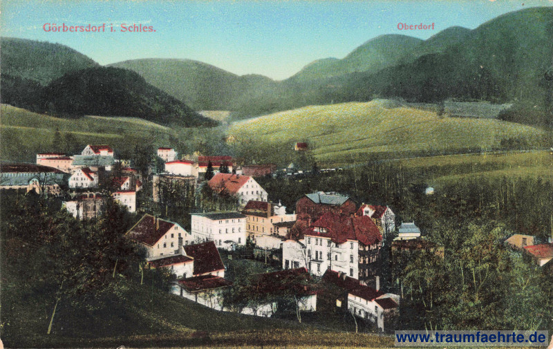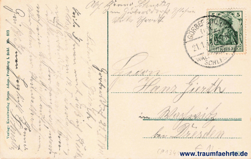 – Details – Jahr: ca. 1910 Status: gelaufen 1911 Beschriftung vorne: Görbersdorf i. Schles. Oberdorf Beschriftung hinten: Verlag: Kunstverlag Herm. Adam, Freiburg i. Schl. No. 403, 228786 Stempel: Görbersdorf, Waldenburg Schles., 21.1.11 6–7N. Hinweis: