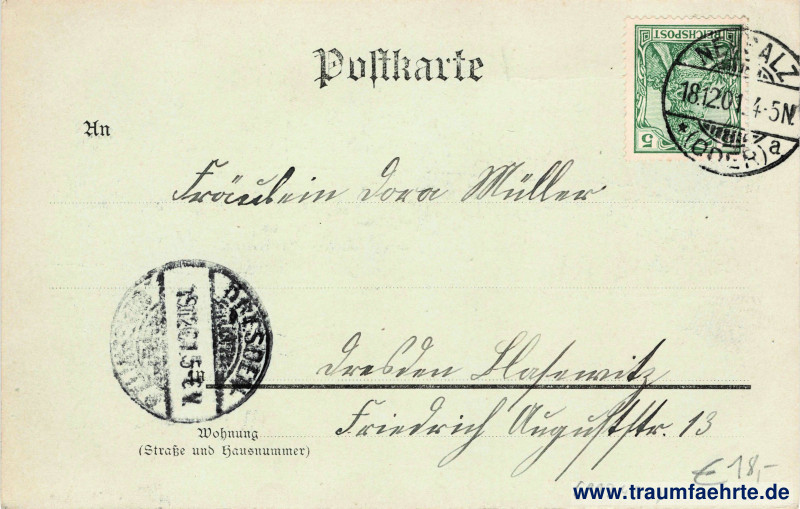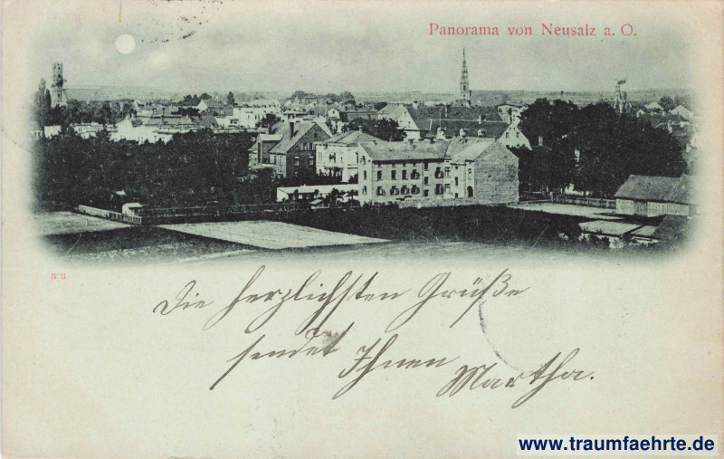 – Details – Jahr: ca. 1900 Status: gelaufen 1901 Beschriftung vorne: Panorama von Neusalz a. O., 3[…]3 Beschriftung hinten: Postkarte, An … in … Wohnung (Straße und Hausnummer) … Stempel: Neusalz (Oder), * a, 18.12.01.4–5N; Dresden-[Neust. 6], 19.12.01.5–6V. Hinweis: