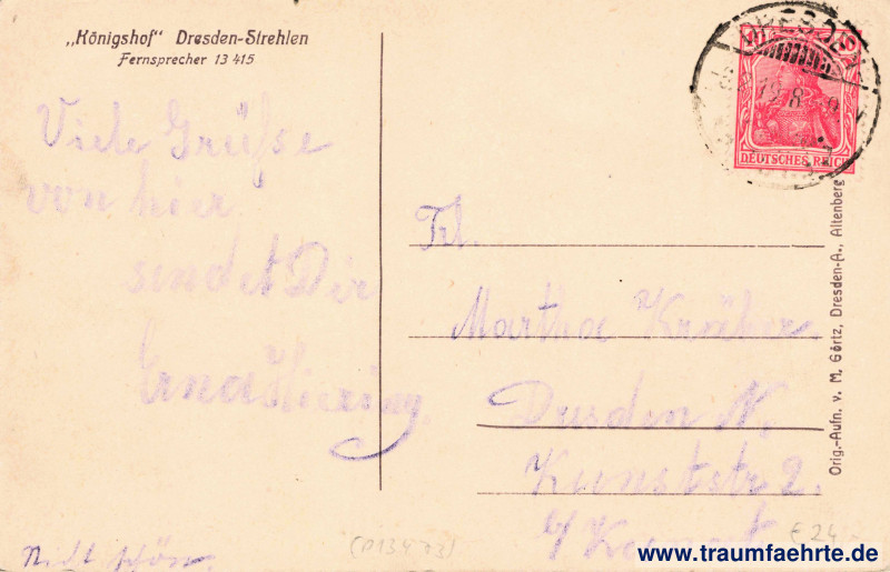 – Details – Year: ca. 1915 Postal state: postally used 1919 Inscription front: Teatersaal Inscription back: „Königshof“ Dresden-Strehlen, Fernsprecher 13 415, Orig.-Aufn. v. M. Görtz, Dresden-A., Altenberg Postmark(s): Dresden-[…], –3.2.19. 8–9[V] Please note: