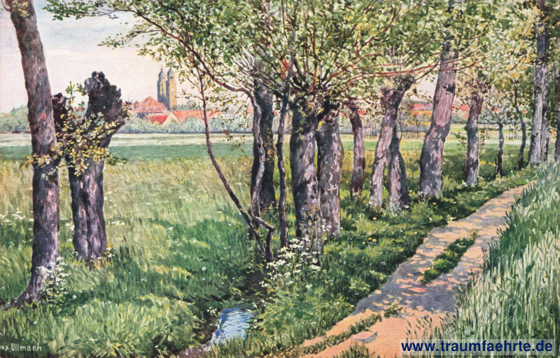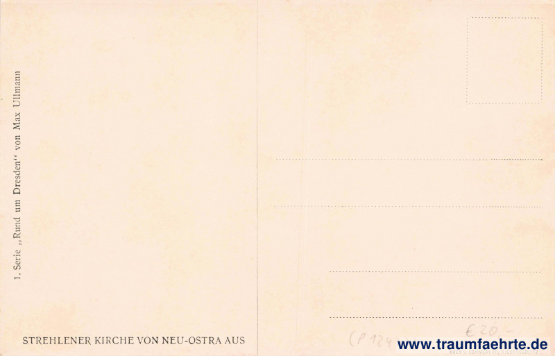 – Details – Jahr: ca. 1920 Status: ungelaufen Beschriftung vorne: Max Ullmann Beschriftung hinten: Strehlener Kirche von Neu-Ostra aus, 1. Serie „Rund um Dresden“ von Max Ullmann, Krey u. Sommerfeld, Niedersedlitz Stempel: keine Hinweis: