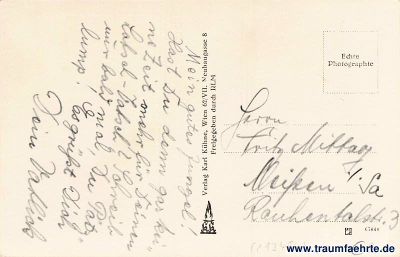 – Details – Jahr: ca. 1940 Status: beschrieben, aber ungelaufen Beschriftung vorne: Reichenau N. D. 5866 Beschriftung hinten: KK Verlag Karl Kühle, Wien 62/VII. Neubaugasse 8, Freigegeben durch RLM, Echte Photographie, LA[…] 67440 Stempel: keine Hinweis: