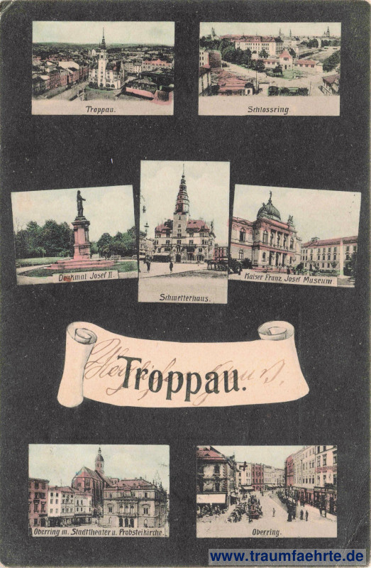 Beschriftung vorne: Troppau. Troppau. Schlossring. Denkmal Josef II. Schmetterhaus. Kaiser Franz Josef Museum. Oberring m. Stadttheater u. Probsteikirche. Oberring.